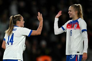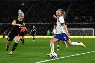 While the free-kick was originally misfired by Aggie Beever-Jones, she made no mistake at the second time of asking as she rifled England in front, with the hosts then doubling their lead on the brink of half-time through birthday girl Lucy Bronze.