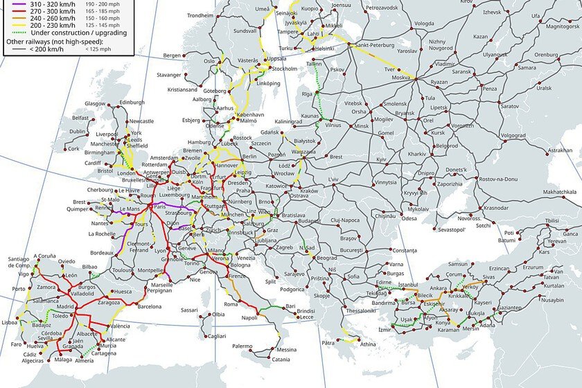 Este mapa de la red ferroviaria de alta velocidad de Europa es el fruto del esfuerzo colaborativo de varios usuarios de Wikimedia Commons, que lo actualizan con frecuencia anual con nuevos proyectos a partir de los datos oficiales de la UIC. Eso sí, una cosa son los datos macro y otra la realidad de este mallado de trenes, porque dentro de la red hay enormes diferencias entre unas zonas y otras. Incluso dentro de la propia catalogación de «alta velocidad».