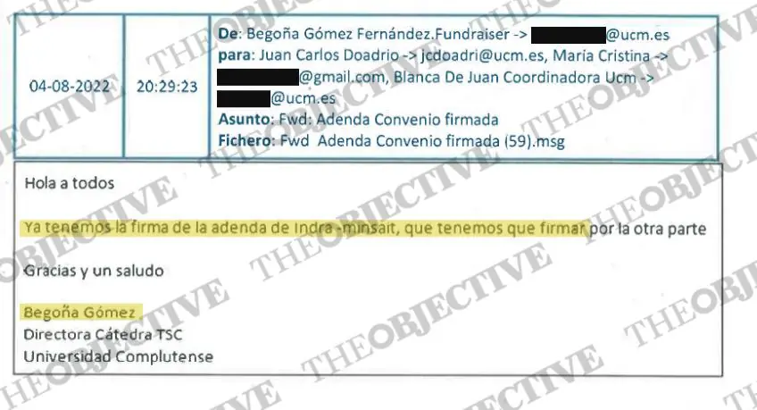 «Hola a todos. Ya tenemos la firma de la adenda de Indra -Minsait, que tenemos que firmar por la otra parte. Gracias y un saludo, Begoña Gómez». Este correo electrónico, fechado el 4 de agosto de 2022 y reenviado a la Complutense por su asistente en Moncloa, Cristina Álvarez, es una de las comunicaciones que la UCO ha incorporado al informe solicitado por el juez Juan Carlos Peinado en el marco de la instrucción del caso Begoña. Un detalle determinante, ya que muestra una referencia temporal sobre el inicio del apoyo por parte de Indra al proyecto: agosto de 2022.